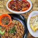 Nasi goreng yang disajikan bersama potongan ayam goreng krispi, menawarkan kombinasi rasa yang memuaskan.