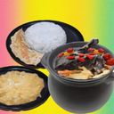 Spicy Sour Vegetables Chicken Soup with rice and egg, with a side of vegetable
