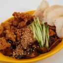 Blanched wantan noodles in soysauce with garlic, white pepper, sesame oil and oyster sauce. Served with steamed chicken