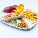 Chicken Shawarma sandwich with garlic sauce served with French fries