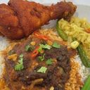 Fried rice cooked with sweet and spicy red sauce, served with vegetables and small piece of chicken