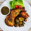 Marinated herbed chicken whole leg served with roasted potatoes & carrots, side salad & gravy