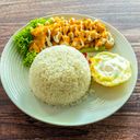 Comes with white rice , chicken chop with cheezy sauce and fried egg