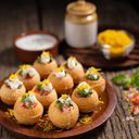 Mini puris filled with chilled yogurt, chutneys & spices creamy, cool, and crunchy!