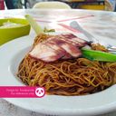 Stir-fried flat rice noodles with spicy curry chicken, a flavorful Malaysian favorite.