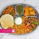A bed of spiced basmati rice pairs perfectly with tender, slow-cooked mutton curry, all accompanied by, chicken curry, tangy pickles, pappadam and a boiled egg