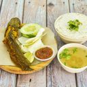 Ikan bawal goreng, ulam, sambal pecal & sup kosong