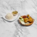 Crispy fried chicken served with a zesty dipping sauce and fragrant rice.