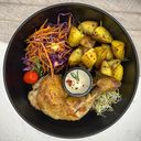 Rosemary marinated chicken thigh sautéed with potatoes, its accompanied with a side salad & béchamel gravy