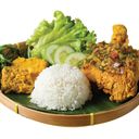 Spicy smashed chicken served with fragrant rice, fresh vegetables, and zesty sambal sauce.