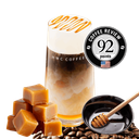 Specialty coffee mixed with freshly steamed milk and Michelin star vanilla syrup, covered with foamed milk with sweet caramel sauce as topping, giving a multi-layered taste