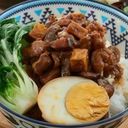Savory braised minced chicken with mushrooms and yam rice.