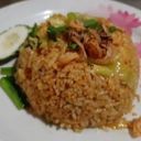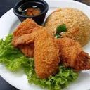 Nasi goreng dihidangkan bersama ayam goreng, telo mata dan timun.
