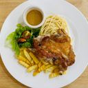 Signature grilled pork chop served with spaghetti, vegetables of the day, US fries & black pepper sauce