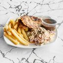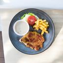 Breaded chicken fried to perfection, with fries, salad and sauce