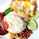 Coconut rice with fried egg, anchovies, peanuts, and sambal.