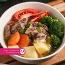 For ref only: fragrant beef soup with ginger, black pepper, carrots, potatoes. Served hot garnished with fried shallots & chopped scallions
