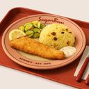 Crispy Pacific crumbed fish and 1 pc broasted chicken with SugarBun's all time favourite savoury rice and tangy fresh pickles
