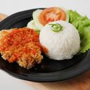 Crispy battered fried chicken, mixed with hot and spicy sambal, served with white rice and traditional salad