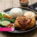 Ayam goreng rangup yang dihancurkan, disalut dengan sambal pedas & dihidangkan bersama nasi