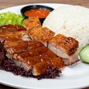 Crispy roasted meat served over fragrant rice, accompanied by savory sauce