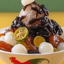 A sweet, icy dessert with green rice flour jelly, coconut milk, and palm sugar syrup.
