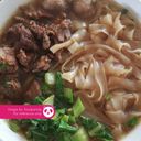 Flat rice noodles in piping hot soup gravy with sliced beef and vegetables