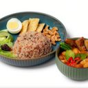 Contain Egg (699kcal) Simple Fried Red Brown Rice with Egg, Red Carrot Cube, Long Bean Cube, Baby Corn Cube & some Hericium Mushroom slices. Served together with Cashew Nuts, Cucumber & Fruits.