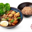 Contain Egg (608kcal) Famous BKT Herbal Soup cooked with authentic traditional chinese herbs. Contains ingredients such as Taupok, Mushrooms, Lettuce, Hericium Mushroom, Beancurd, Egg and served with Red Brown Rice.