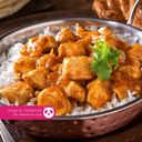 Tender chicken in rich, creamy coconut sauce, served with fragrant rice and vibrant accompaniments.