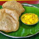 Poori with potatoes cooked with onions, mildly spiced with hints of ginger, curry leaves .