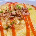 Fried egg with a golden yolk, served over fragrant rice and topped with savory sauce.