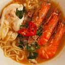 Fried springy instant noodles with chilli paste, soy sauce, added with fresh prawns, leafy greens & sliced red chillies