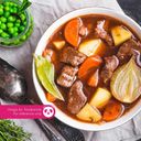 For ref only: Fragrant beef soup with ginger, black pepper, carrots, potatoes. Served hot garnished with fried shallots and chopped scallions