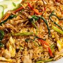Traditional Malaysian fried rice dish cooked with shallots, garlic, chili, anchovies, and vegetables served with fried chicken