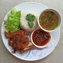 Spicy Indonesian fried chicken with sambal chili sauce, served with rice and fresh vegetables.