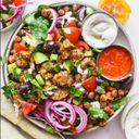 Korean Chicken with coral lettuce, stir-fried carrot slice, stir-fried sweet onion, sweet corn, japanese cucumber, egg Comes with BROWN RICE + RED RICE