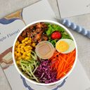 Teriyaki flavour Chicken with coral lettuce, carrot slice, purple cabbage, sweet corn, japanese cucumber, cherry tomato. Comes with BROWN RICE + RED RICE