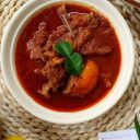 Asam pedas daging tetel (lembu) bersama nasi putih, telur masin dan ulam