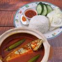 Asam pedas ikan tenggiri bersama nasi putih, telur masin dan ulam
