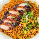 Delicious Wantan Mee topped with tender chicken, served with savory broth and fresh greens.