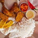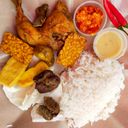 Nasi, ayam ,tauhu, tempe, hati, pedal, timun & kubis