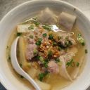 Delicate noodles in a savory broth, garnished with fresh vegetables and aromatic herbs.