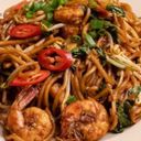 Noodles fried in crispy egg omelette, and coated with a thick broth of prawns, chicken, fish cakes and mix vegetables.