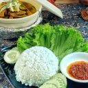 Smoky meat cooked in spicy coconut sauce, served with rice, fresh herbs, and sambal.