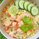 Fragrant Thai-style fried brown rice cook with olive oil and organic seafood , egg, and aromatic herbs, served with lime and chili
