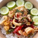 Flavorful stir-fried cook with olive oil with and organic seafood with fragrant basil, chili, and garlic, served with steamed brown rice.