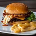 Australian beef with onions, capsicums, and mozzarella cheese in Swiss croissant, served with chips and fresh salad