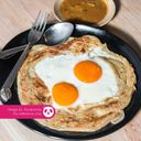 Flaky prata stuffed with eggs and caramelized onions, served with a side of tangy sauce.