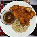 Nasi Goreng with crispy chicken chop, fried to perfection, served with savory rice.